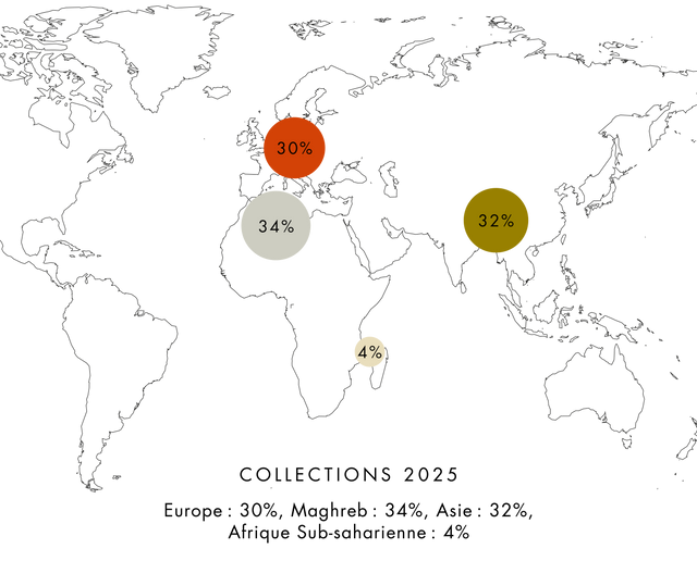 Dans notre vision de la slow fashion, nous mettons l’accent sur la durabilité de nos pièces mais également sur la durabilité de nos relations en construisant des relations de fidélité avec nos partenaires. 43% d’entre eux nous accompagnent depuis plus de cinq ans. Ces fournisseurs connaissent nos produits, nos exigences et travaillent avec nous dans l’amélioration de nos modèles. C’est pourquoi nous ne nous arrêtons pas à leur situation géographique. Cependant, nous faisons notre maximum pour développer de nouveaux partenariats locaux, en Europe ou au Maghreb.
