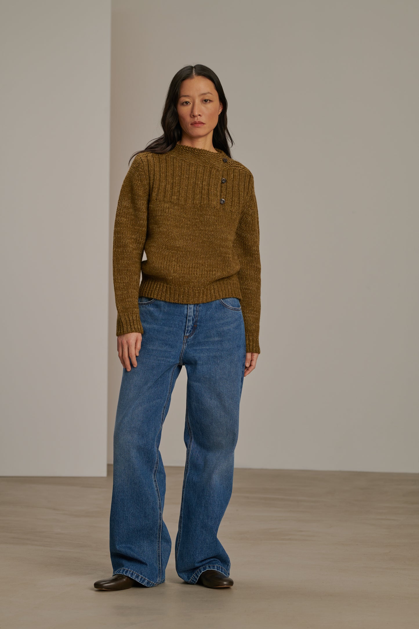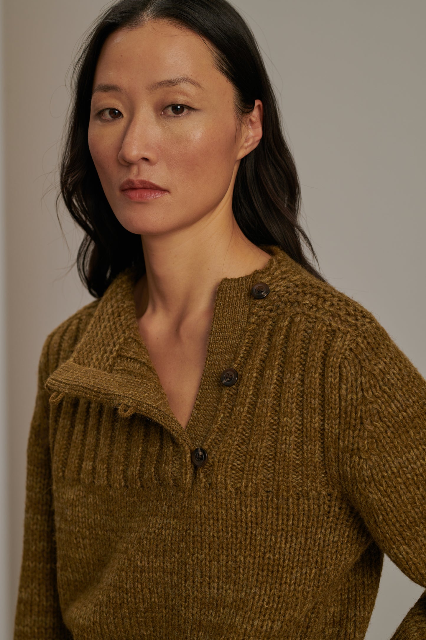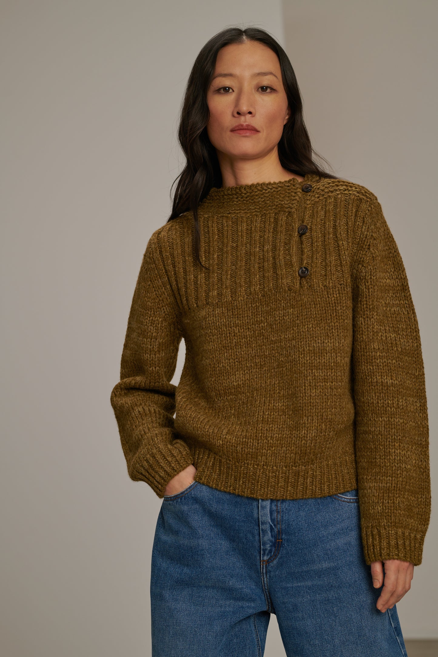 BISCAROSSE est un pull à manches longues, tricoté dans un fil chiné de laine vierge. Tricoté dans une maille épaisse mais aérée, il est souple et confortable. Une ouverture boutonnée sur le devant permet de laisser apparaître un décolleté sur le côté. Par un effet visuel de côtes, la couleur se révèle chinée en nuances de kaki et bronze.