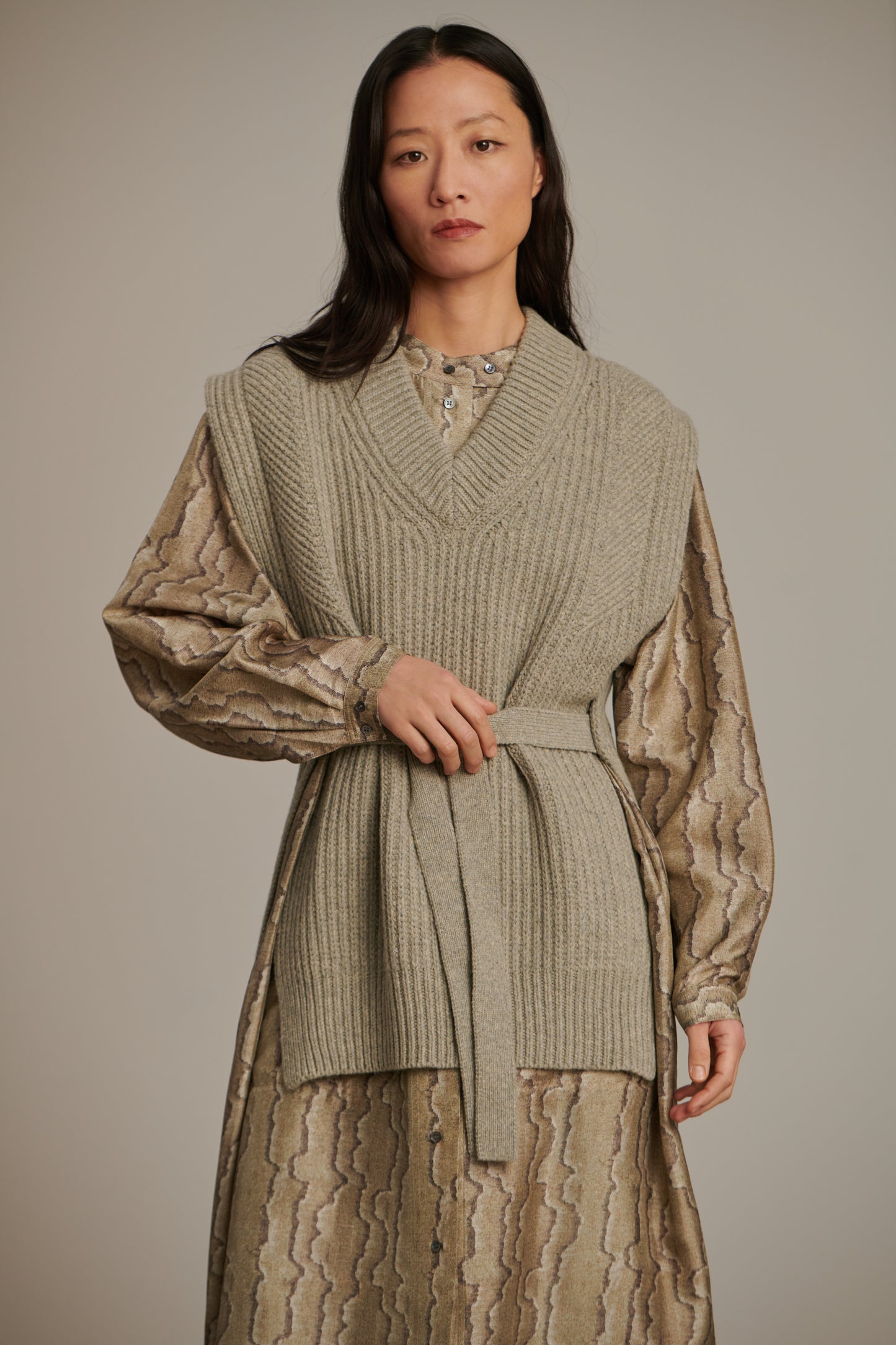 COSTA est un plastron droit, tricoté dans un fil de laine vierge. Rendu visuel par un effet de côtes, des liens sur les côtés se portent ceinturés pour marquer la taille, ou laissés suspendus. Un vêtement idéal pour réchauffer une tenue, tel une robe en soie ou une chemise liquette en coton.
