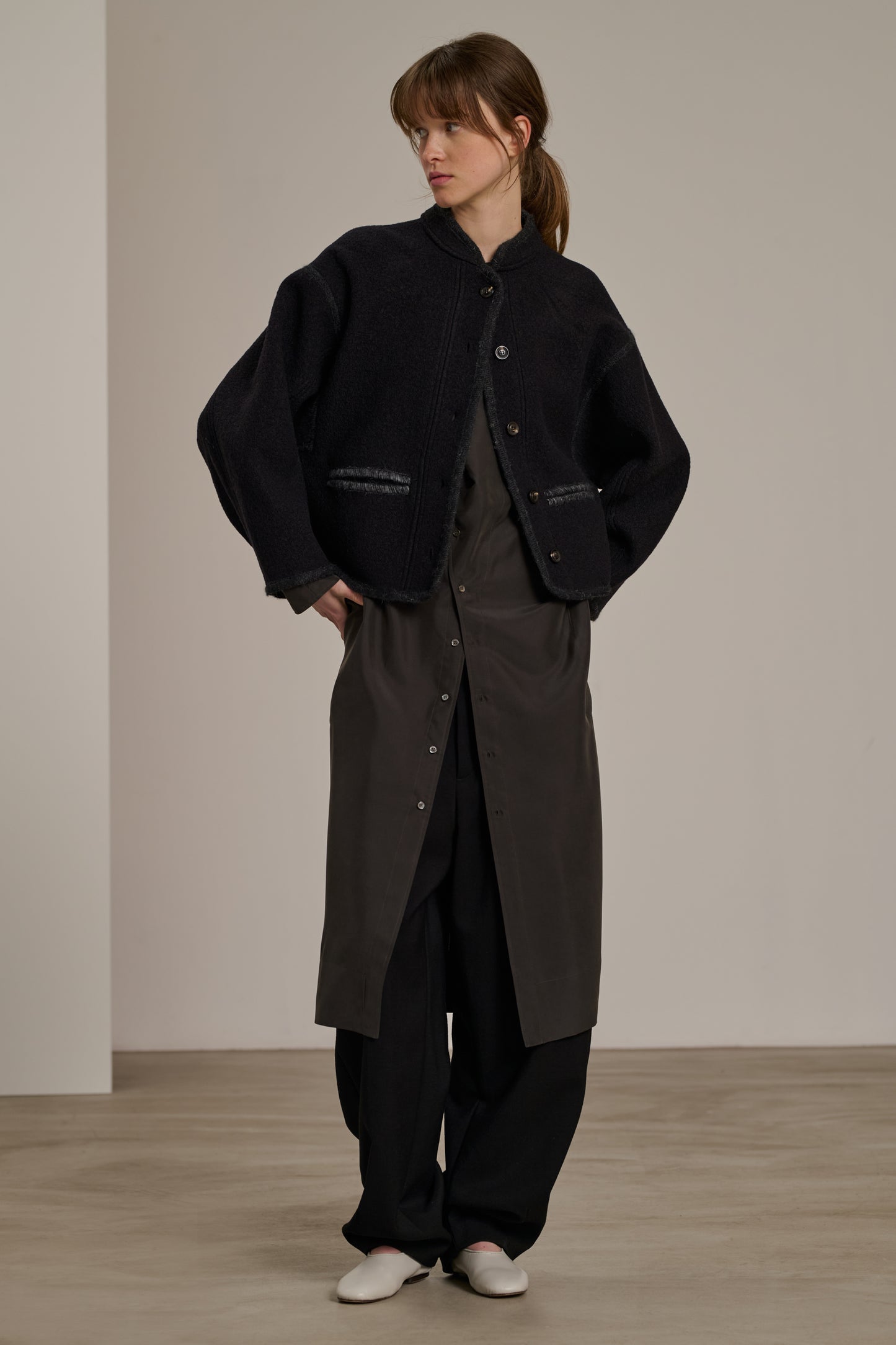 OLYMPE est une veste en laine épaisse, au volume court joliment suspendu au-dessus de la taille. Elle s'accorde aussi bien avec un pantalon tailleur qu'un jean décontracté, offrant une polyvalence qui saura sublimer toutes vos tenues.